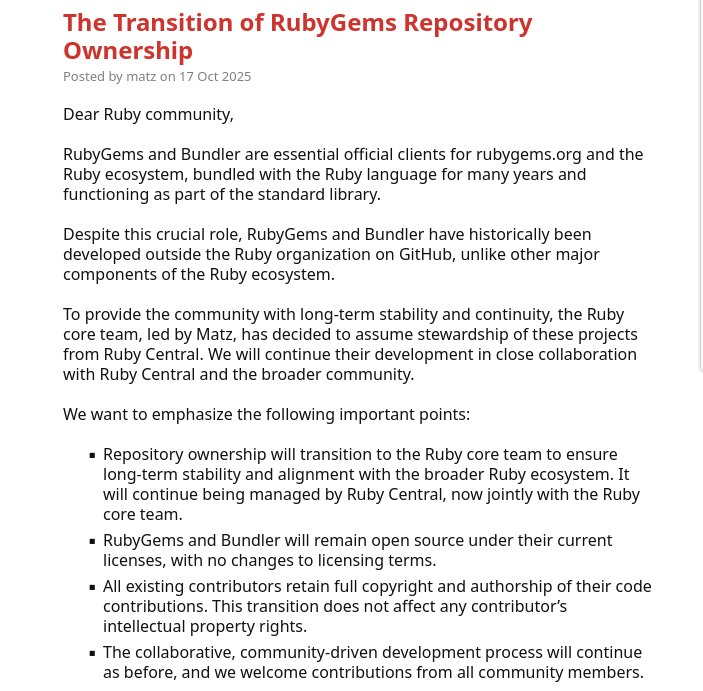 Мейнтейнеры Ruby берут бразды правления: теперь они управляют репозиторием RubyGems на GitHub