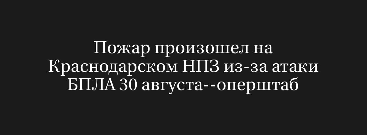 МОСКВА, 30 августа (Рейтер) – 30 августа на Краснодарском нефтеперерабатывающем заводе произошел пожар, вызванный падением частей беспилотного летательного аппарата (БПЛА), сообщил оперативный штаб Краснодарского края.