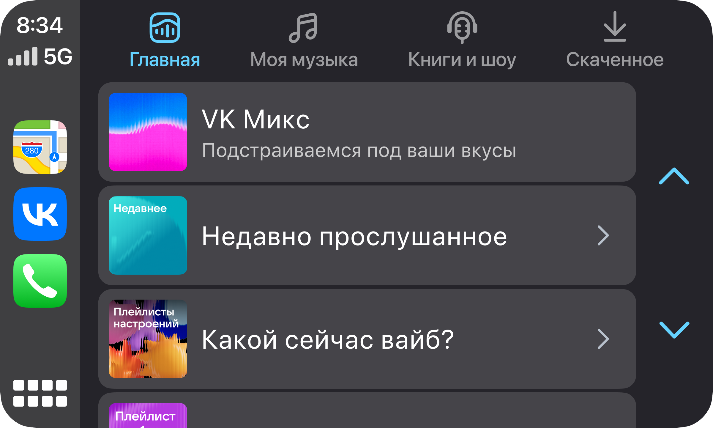 В конце марта 2025 года пользователи Apple CarPlay получили доступ к основным функциям музыкального сервиса «VK Музыка». На дисплее автомобильного монитора стали доступны четыре категории: «Главная», «Моя Музыка», «Книги и шоу» и «Скачанное». В разделе «Главная» можно найти рекомендации «VK Микс», недавно прослушанные треки и блок с информацией о текущем настроении.