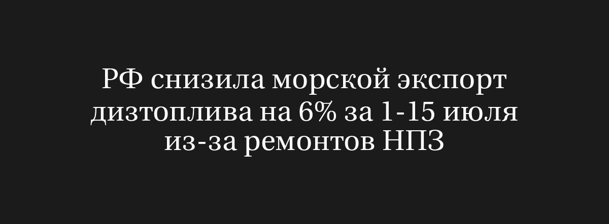 МОСКВА, 18 июля (Рейтер) – В России экспорт дизельного топлива из морских портов за период с 1 по 15 июля сократился на 6% по сравнению с аналогичными данными за июнь, составив 1,43 миллиона тонн. Это снижение связано с проведением ремонтных работ на нефтеперерабатывающих заводах и высоким спросом на внутреннем рынке, согласно информации от LSEG и отраслевых источников.