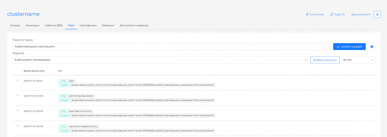 Пользователи могут просматривать, фильтровать и экспортировать логи в интерфейсе кластера, а также настраивать параметры хранения и ротации логов.