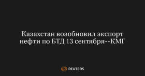 МОСКВА, 17 сентября (Рейтер) – Казахстан возобновил поставки нефти из месторождения Кашаган по нефтепроводу Баку-Тбилиси-Джейхан (БТД) 13 сентября, отгрузив 8.800...